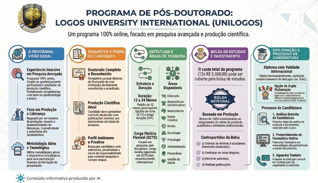 O Programa de pós-doutorado da UNILOGOS oferece uma experiência imersiva em pesquisa e produção a ser realizado de forma totalmente on-line. A criação e implementação deste Programa é o resultado da integração de renomados pesquisadores e a Logos University (UNILOGOS), composto de corpo docente titular (professores estrangeiros) e corpo docente convidado (várias nacionalidades). O PPDC da UniLogos foi implementado com o objetivo de ampliação do espaço de pesquisa e aperfeiçoamento profissional, fortalecendo as competências do indivíduo com base na