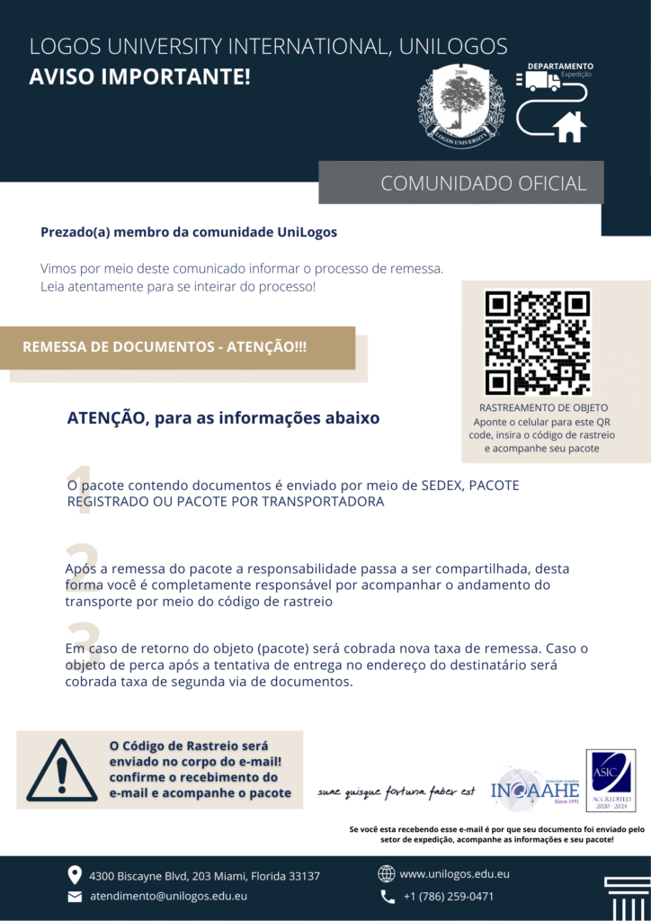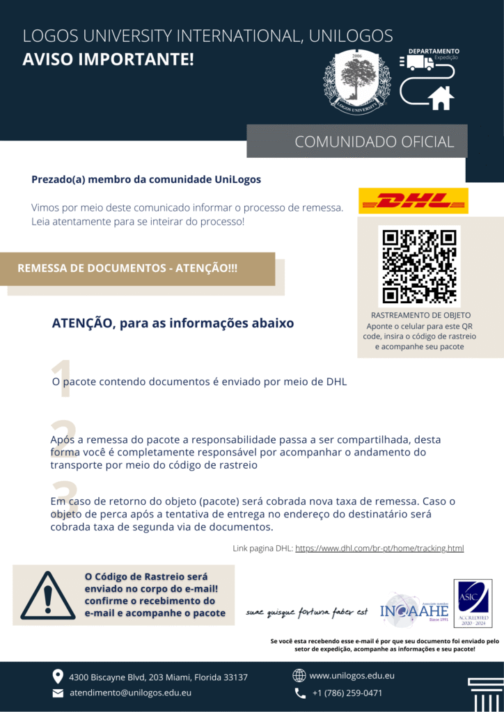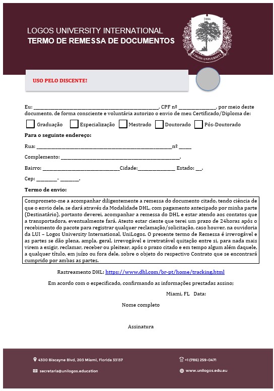 Comprometo-me a acompanhar diligentemente a remessa do documento citado, tendo ciência de que o envio dele, se dará através da Modalidade DHL/SEDEX, com pagamento antecipado por minha parte (Destinatário), portanto deverei, acompanhar a remessa do DHL/CORREIOS e estar atendo aos contatos que a transportadora, eventualmente fará. Atesto estar ciente que terei um prazo de 24horas após o recebimento do pacote para registrar qualquer reclamação/solicitação, caso houver, na ouvidoria da LUI – Logos University International, UniLogos. O presente termo de Remessa é irrevogável e as partes se dão plena, ampla, geral, irrevogável e irretratável quitação entre si, para nada mais virem a exigir, reclamar, receber ou pleitear, após o prazo citado e em tempo algum além daquele, a qualquer título, em juízo ou fora dele, sobre o objeto do respectivo Contrato que se encontrará cumprido por ambas as partes.